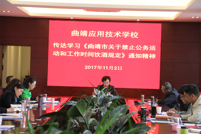 为贯彻全面从严治党要求,进一步落实中央八项规定精神和省、市委实施办法,加强党风廉政建设,持之以恒纠正“四风”,11月2日下午,学校传达学习《曲靖市党政机关国内公务接待管理实施细则》和《曲靖市关于禁止公务活动和工作时间饮酒的规定(试行)》文件精神。会议由学校党委书记、校长吕庆芬主持,学校中层管理及以上管理人员参加了此次会议。