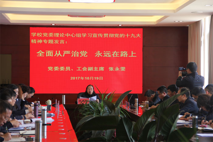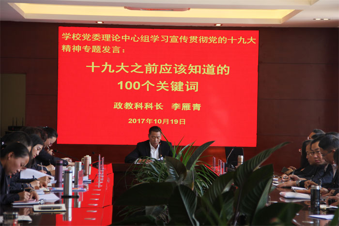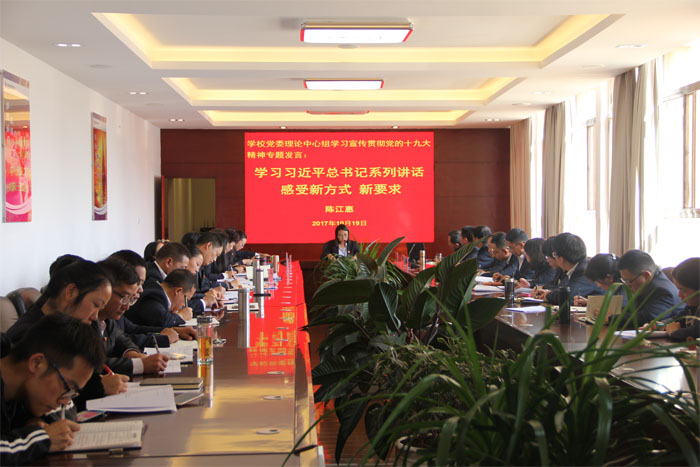 10月19日下午,学校开展学习宣传贯彻党的十九大精神系列活动之二:学校党委理论中心组召开学习宣传贯彻党的十九大精神专题发言会。本次专题发言以“学习宣传贯彻党的十九大精神”为主要内容。会议由学校党委委员、副校长徐敏同志主持。学校党政班子成员及全体中层管理人员参加了会议。
