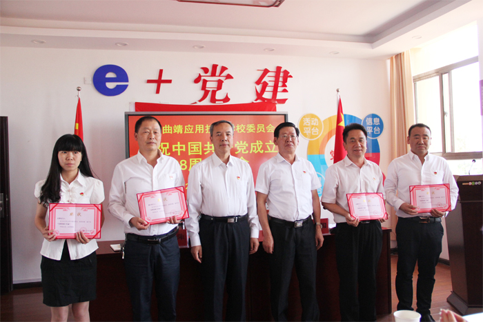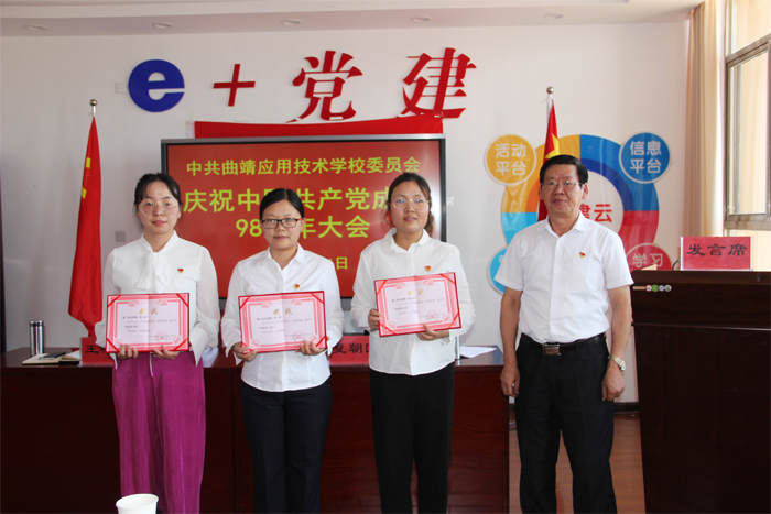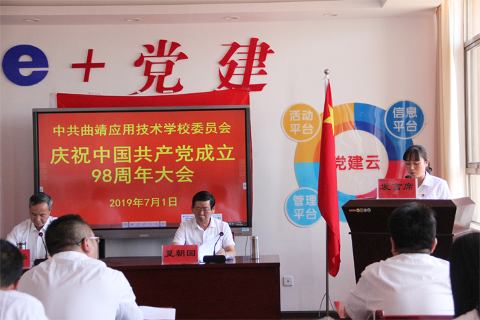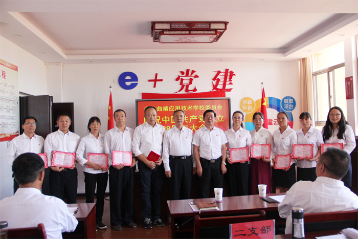 庆祝大会在庄严的国歌声中拉开帷幕。会议首先由学校党委副书记、校长王宗舜同志宣读《中共曲靖应用技术学校委员会关于表彰2018年度先进党组织、优秀共产党员及优秀党务工作者的决定》。学校党委书记夏朝国同志,党委副书记、校长王宗舜同志对获奖的1个先进党支部、3个先进党小组、11名优秀共产党员和4名优秀党务工作者进行颁奖。随后,先进党支部组织委员潘娥同志、先进党小组组长代表王淋鋆同志、优秀共产党员代表张美珍同志分别在会上作了交流发言。
