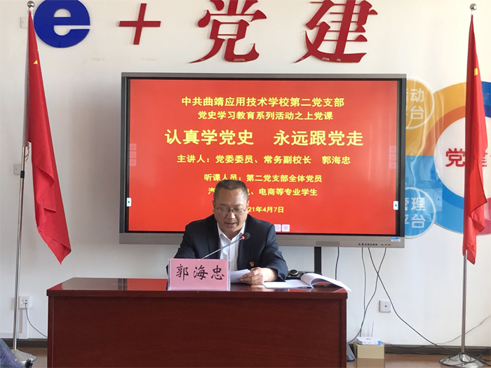 为深入学习习近平总书记在党史学习教育动员大会上的重要讲话精神,认真贯彻落实学校关于开展党史学习教育的安排部署,4月7日下午,学校党委委员、常务副校长郭海忠以《认真学党史 永远跟党走》为题给第二党支部全体党员、入党申请教师和支部联系专业的学生上党课。