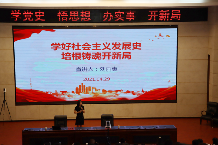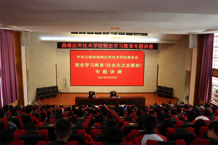 4月29日下午,学校举办党史学习教育(社会主义发展史)专题讲座,邀请曲靖师范学院马克思主义学院教研室主任刘丽惠作题为《学好社会主义发展史 培根铸魂开新局》的专题讲座。会议由学校党委书记夏朝国同志主持,全体师生参加会议。主会场设在智远楼报告厅,全体教职工在主会场参加会议 ;分会场设在各班教室,全体学生在分会场参加会议。